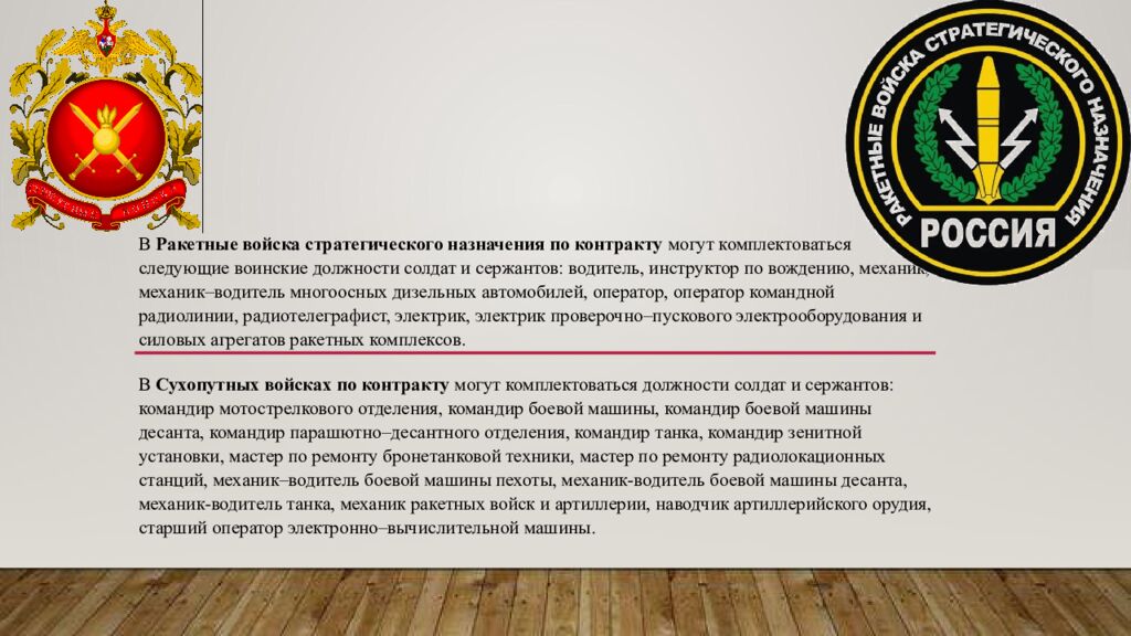 В Ракетные войска стратегического назначения по контракту могут комплектоваться следующие воинские должности солдат и сержантов: водитель, инструктор по вождению, механик, механик – водитель многоосных дизельных автомобилей, оператор, оператор командной радиолинии, радиотелеграфист, электрик, электрик проверочно – пускового электрооборудования и силовых агрегатов ракетных комплексов. В Сухопутных войсках по контракту могут комплектоваться должности солдат и сержантов: командир мотострелкового отделения, командир боевой машины, командир боевой машины десанта, командир парашютно – десантного отделения, командир танка, командир зенитной установки, мастер по ремонту бронетанковой техники, мастер по ремонту радиолокационных станций, механик – водитель боевой машины пехоты, механик-водитель боевой машины десанта, механик-водитель танка, механик ракетных войск и артиллерии, наводчик артиллерийского орудия, старший оператор электронно –вычислительной машины. назначения
