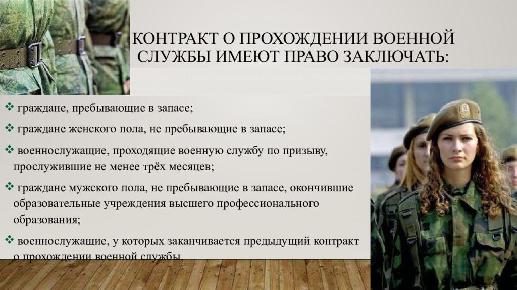 граждане, пребывающие в запасе; граждане женского пола, не пребывающие в запасе; военнослужащие, проходящие военную службу по призыву, прослужившие не менее трёх месяцев; граждане мужского пола, не пребывающие в запасе, окончившие образовательные учреждения высшего профессионального образования; военнослужащие, у которых заканчивается предыдущий контракт о прохождении военной службы. Контракт о прохождении военной службы имеют право заключать: