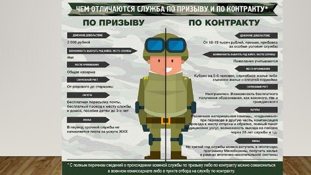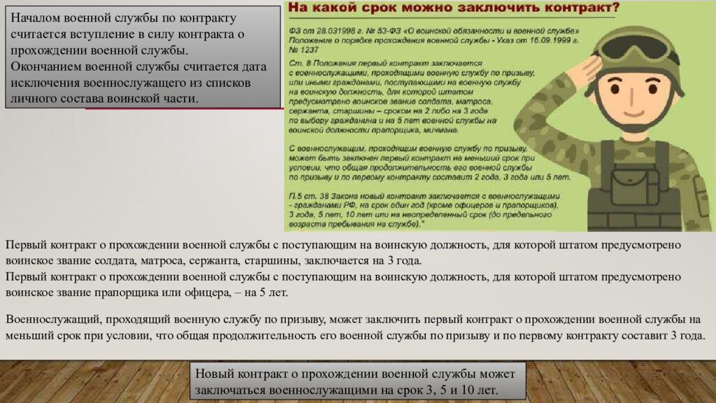Первый контракт о прохождении военной службы с поступающим на воинскую должность, для которой штатом предусмотрено воинское звание солдата, матроса, сержанта, старшины, заключается на 3 года. Первый контракт о прохождении военной службы с поступающим на воинскую должность, для которой штатом предусмотрено воинское звание прапорщика или офицера, – на 5 лет. Военнослужащий, проходящий военную службу по призыву, может заключить первый контракт о прохождении военной службы на меньший срок при условии, что общая продолжительность его военной службы по призыву и по первому контракту составит 3 года. Началом военной службы по контракту считается вступление в силу контракта о прохождении военной службы. Окончанием военной службы считается дата исключения военнослужащего из списков личного состава воинской части. Новый контракт о прохождении военной службы может заключаться военнослужащими на срок 3, 5 и 10 лет.