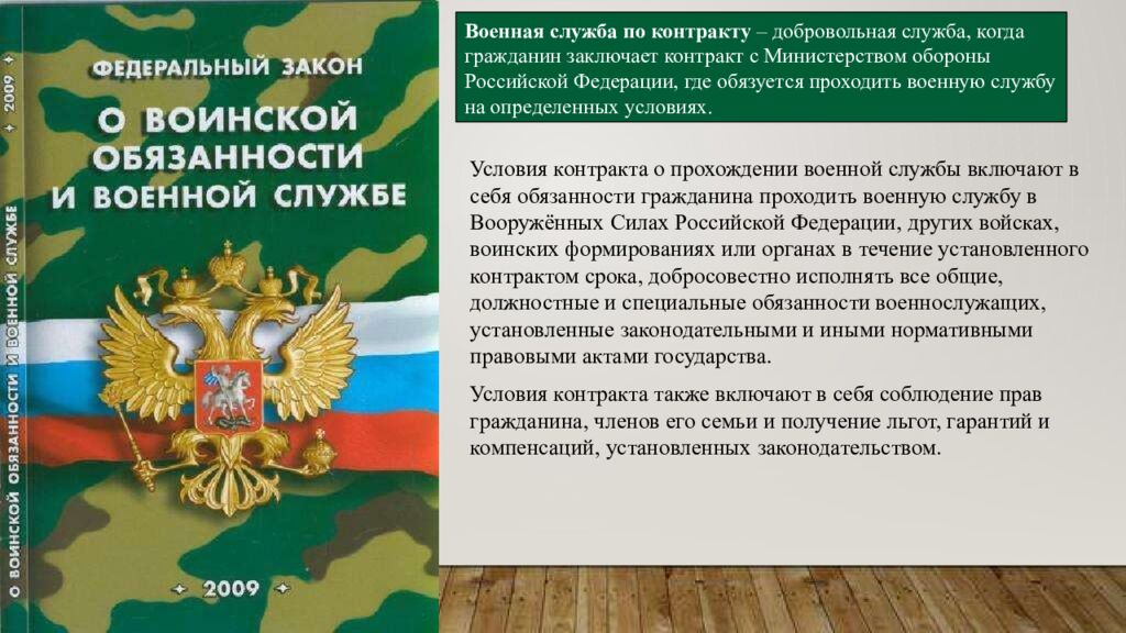 Условия контракта о прохождении военной службы включают в себя обязанности гражданина проходить военную службу в Вооружённых Силах Российской Федерации, других войсках, воинских формированиях или органах в течение установленного контрактом срока, добросовестно исполнять все общие, должностные и специальные обязанности военнослужащих, установленные законодательными и иными нормативными правовыми актами государства. Условия контракта также включают в себя соблюдение прав гражданина, членов его семьи и получение льгот, гарантий и компенсаций, установленных законодательством. Военная служба по контракту – добровольная служба, когда гражданин заключает контракт с Министерством обороны Российской Федерации, где обязуется проходить военную службу на определенных условиях.