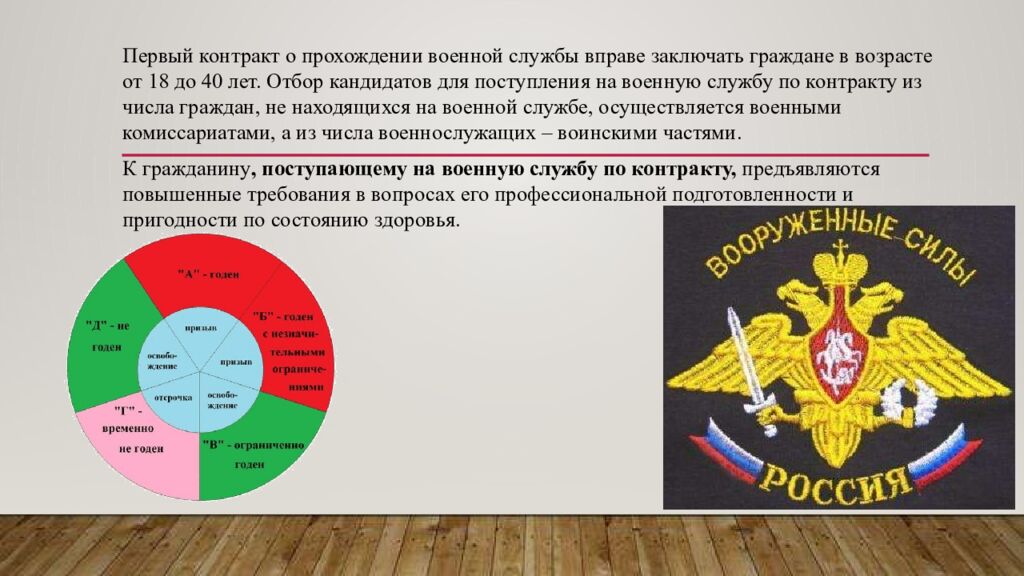 Первый контракт о прохождении военной службы вправе заключать граждане в возрасте от 18 до 40 лет. Отбор кандидатов для поступления на военную службу по контракту из числа граждан, не находящихся на военной службе, осуществляется военными комиссариатами, а из числа военнослужащих – воинскими частями. К гражданину, поступающему на военную службу по контракту, предъявляются повышенные требования в вопросах его профессиональной подготовленности и пригодности по состоянию здоровья.