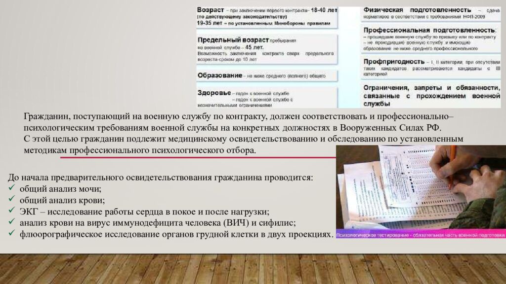 До начала предварительного освидетельствования гражданина проводится: общий анализ мочи; общий анализ крови; ЭКГ – исследование работы сердца в покое и после нагрузки; анализ крови на вирус иммунодефицита человека (ВИЧ) и сифилис; флюорографическое исследование органов грудной клетки в двух проекциях. Гражданин, поступающий на военную службу по контракту, должен соответствовать и профессионально–психологическим требованиям военной службы на конкретных должностях в Вооруженных Силах РФ. С этой целью гражданин подлежит медицинскому освидетельствованию и обследованию по установленным методикам профессионального психологического отбора.