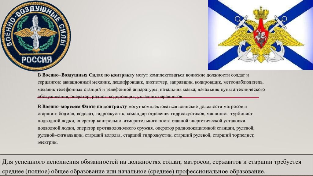 В Военно – Воздушных Силах по контракту могут комплектоваться воинские должности солдат и сержантов: авиационный механик, дешифровщик, диспетчер, заправщик, кодировщик, метеонаблюдатель, механик телефонных станций и телефонной аппаратуры, начальник маяка, начальник пункта технического обслуживания, оператор, радист – кодировщик, укладчик парашютов. В Военно – морском Флоте по контракту могут комплектоваться воинские должности матросов и старшин: боцман, водолаз, гидроакустик, командир отделения гидроакустиков, машинист – турбинист подводной лодки, оператор контрольно – измерительного поста главной энергетической установки подводной лодки, оператор противолодочного оружия, оператор радиолокационной станции, рулевой, рулевой – сигнальщик, старший водолаз, старший гидроакустик, старший рулевой, старший торпедист, электрик. Для успешного исполнения обязанностей на должностях солдат, матросов, сержантов и старшин требуется среднее (полное) общее образование или начальное (среднее) профессиональное образование.