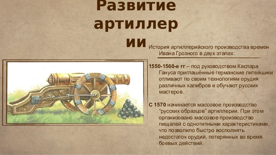 История артиллерийского производства времен Ивана Грозного в двух этапах: 1550-1560-е гг – под руководством Каспара Гануса приглашённые германские литейщики отливают по своим технологиям орудия различных калибров и обучают русских мастеров. С 1570 начинается массовое производство “русских образцов” артиллерии. При этом организовано массовое производство пищалей с однотипными характеристиками, что позволило быстро восполнять недостаток орудий, потерянных во время боевых действий. Развитие артиллерии