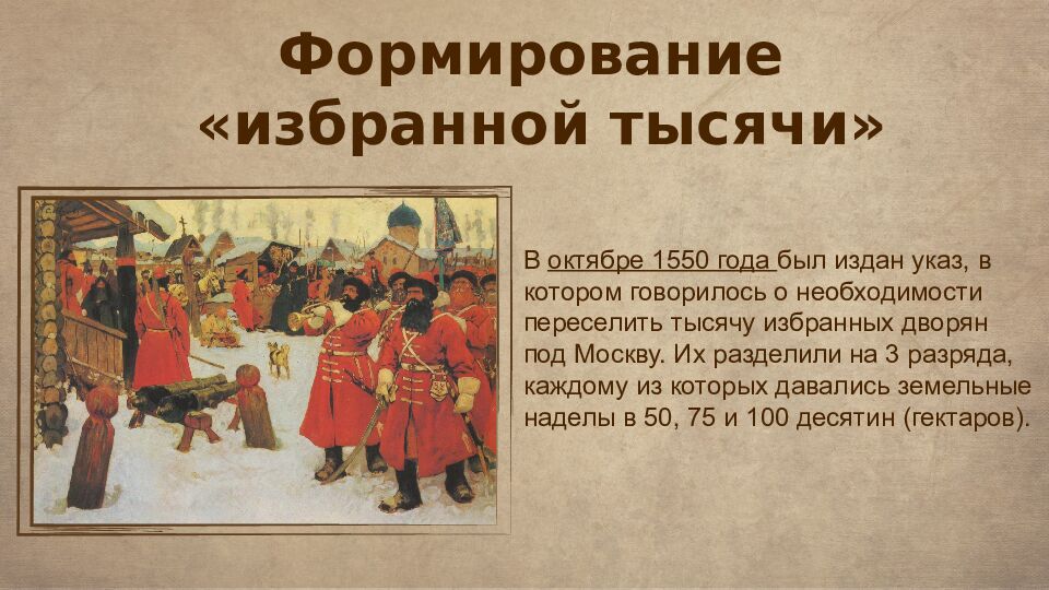 В октябре 1550 года был издан указ, в котором говорилось о необходимости переселить тысячу избранных дворян под Москву. Их разделили на 3 разряда, каждому из которых давались земельные наделы в 50, 75 и 100 десятин (гектаров).