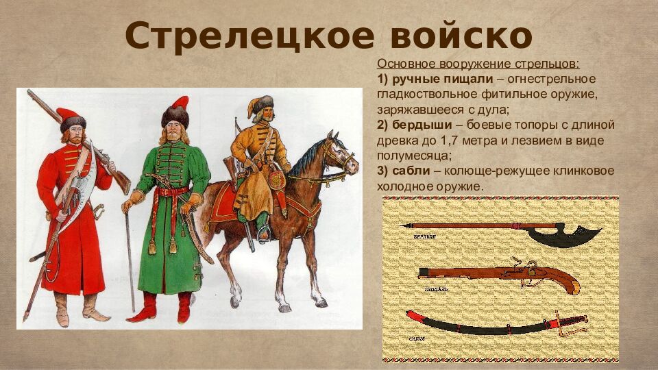 Стрелецкое войско Основное вооружение стрельцов : 1) ручные пищали – огнестрельное гладкоствольное фитильное оружие, заряжавшееся с дула ; 2) бердыши – боевые топоры с длиной древка до 1,7 метра и лезвием в виде полумесяца ; 3) сабли – колюще-режущее клинковое холодное оружие.