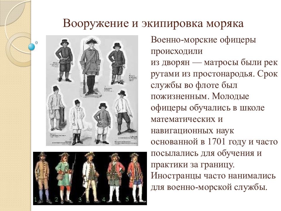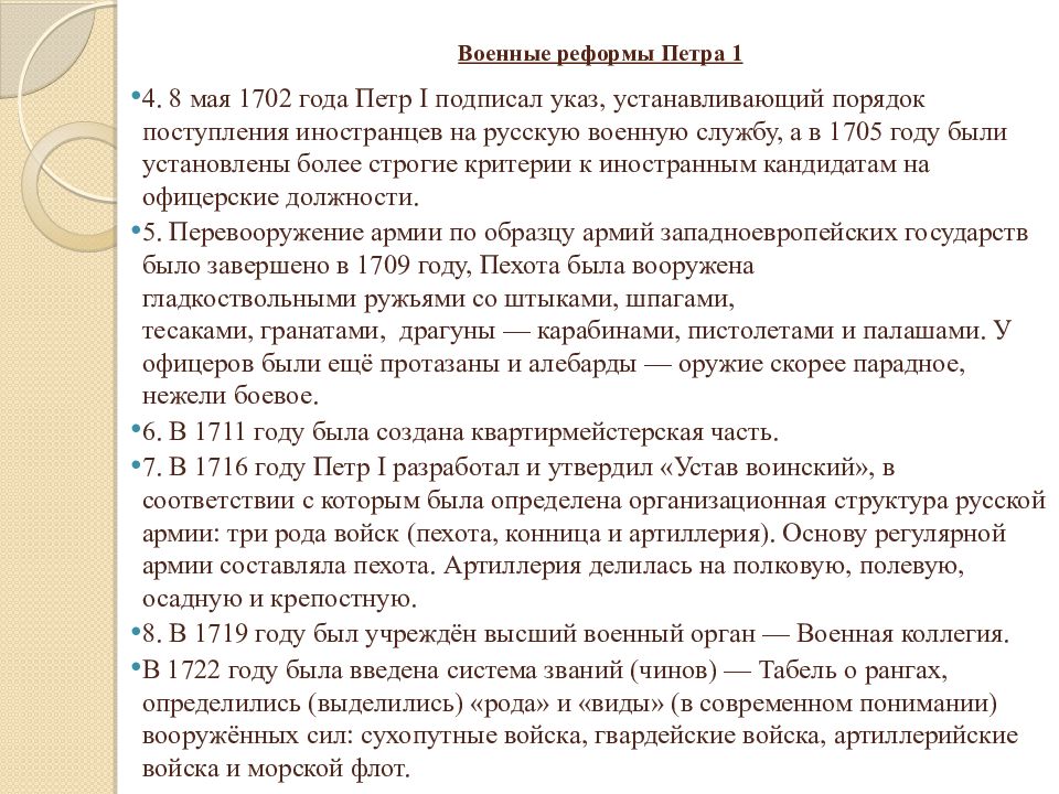4. 8 мая 1702 года Петр I подписал указ, устанавливающий порядок поступления иностранцев на русскую военную службу, а в 1705 году были установлены более строгие критерии к иностранным кандидатам на офицерские должности. 5. Перевооружение армии по образцу армий западноевропейских государств было завершено в 1709 году, Пехота была вооружена гладкоствольными ружьями со штыками, шпагами, тесаками, гранатами, драгуны — карабинами, пистолетами и палашами. У офицеров были ещё протазаны и алебарды — оружие скорее парадное, нежели боевое. 6. В 1711 году была создана квартирмейстерская часть. 7. В 1716 году Петр I разработал и утвердил «Устав воинский», в соответствии с которым была определена организационная структура русской армии: три рода войск (пехота, конница и артиллерия). Основу регулярной армии составляла пехота. Артиллерия делилась на полковую, полевую, осадную и крепостную. 8. В 1719 году был учреждён высший военный орган — Военная коллегия. В 1722 году была введена система званий (чинов) — Табель о рангах, определились (выделились) «рода» и «виды» (в современном понимании) вооружённых сил: сухопутные войска, гвардейские войска, артиллерийские войска и морской флот.