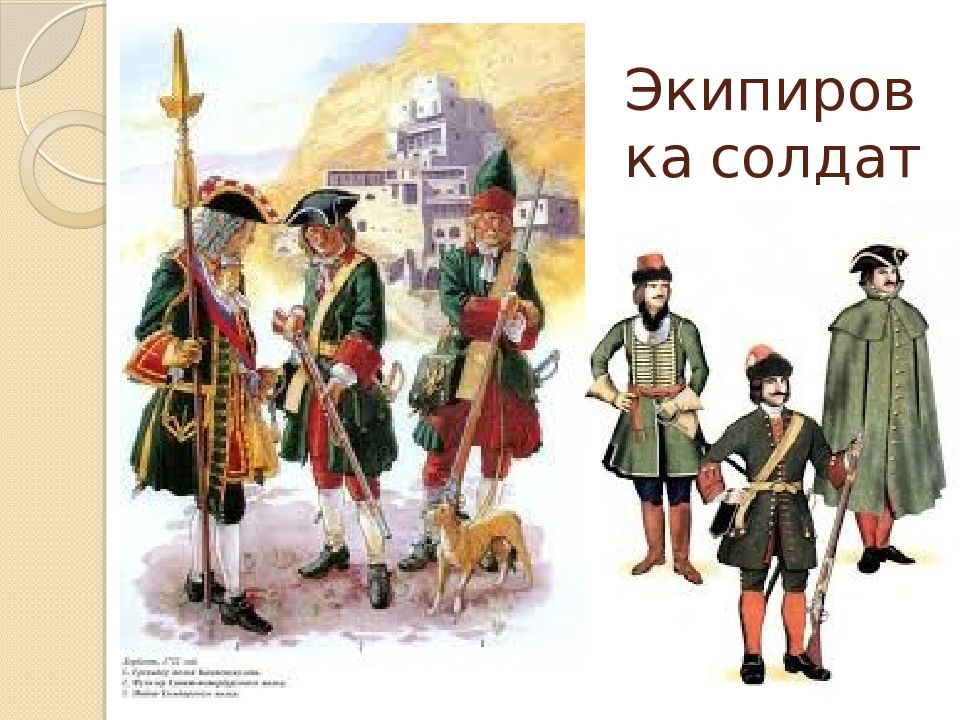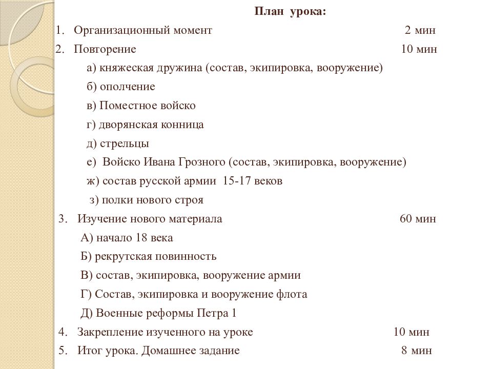 План урока: 1. Организационный момент 2 мин 2. Повторение 10 мин а) княжеская дружина (состав, экипировка, вооружение) б) ополчение в) Поместное войско г) дворянская конница д ) стрельцы е) Войско Ивана Грозного (состав, экипировка, вооружение) ж) состав русской армии 15-17 веков з ) полки нового строя 3. Изучение нового материала 60 мин А) начало 18 века Б) рекрутская повинность В) состав, экипировка, вооружение армии Г) Состав, экипировка и вооружение флота Д) Военные реформы Петра 1 4. Закрепление изученного на уроке 10 мин 5. Итог урока. Домашнее задание 8 мин