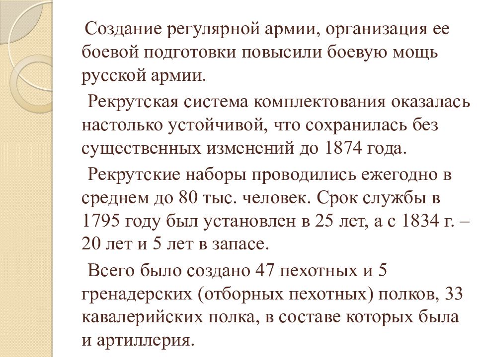 Создание регулярной армии, организация ее боевой подготовки повысили боевую мощь русской армии. Рекрутская система комплектования оказалась настолько устойчивой, что сохранилась без существенных изменений до 1874 года. Рекрутские наборы проводились ежегодно в среднем до 80 тыс. человек. Срок службы в 1795 году был установлен в 25 лет, а с 1834 г. – 20 лет и 5 лет в запасе. Всего было создано 47 пехотных и 5 гренадерских (отборных пехотных) полков, 33 кавалерийских полка, в составе которых была и артиллерия.