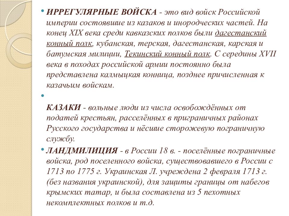 ИРРЕГУЛЯРНЫЕ ВОЙСКА - это вид войск Российской империи состоявшие из казаков и инородческих частей. На конец XIX века среди кавказских полков были дагестанский конный полк, кубанская, терская, дагестанская, карская и батумская милиции, Текинский конный полк. С середины XVII века в походах российской армии постоянно была представлена калмыцкая конница, позднее причисленная к казачьим войскам. КАЗАКИ - вольные люди из числа освобождённых от податей крестьян, расселённых в приграничных районах Русского государства и нёсшие сторожевую пограничную службу. ЛАНДМИЛИЦИЯ - в России 18 в. - поселённые пограничные войска, род поселенного войска, существовавшего в России с 1713 по 1775 г. Украинская Л. учреждена 2 февраля 1713 г. (без названия украинской), для защиты границы от набегов крымских татар, и была составлена из 5 пехотных некомплектных полков и т.д.