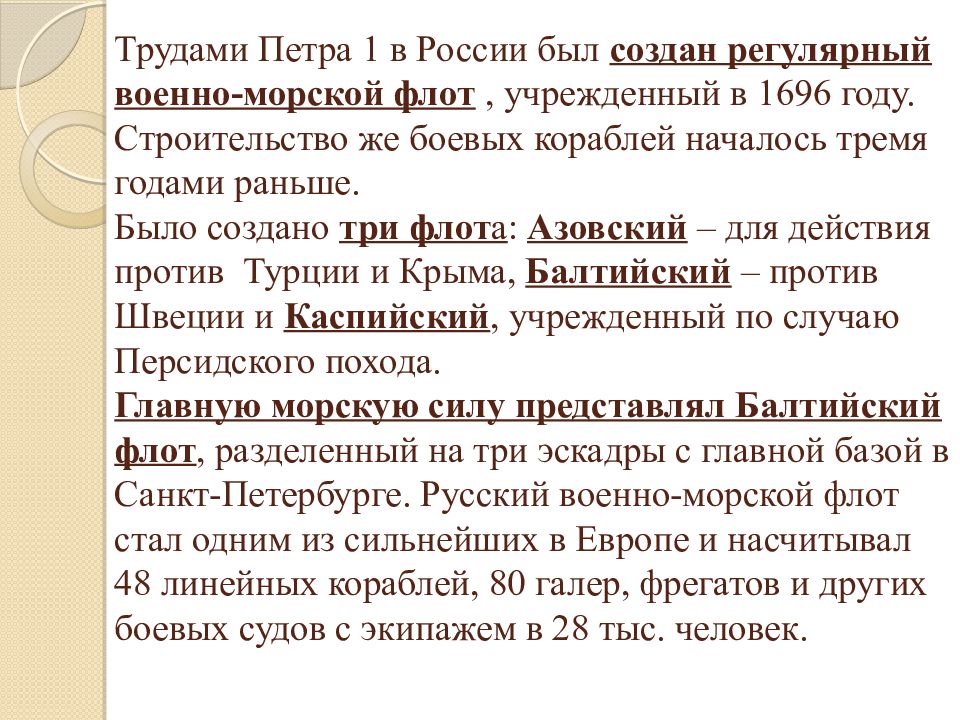 Слайд 22: Трудами Петра 1 в России был создан регулярный военно-морской флот, учрежденный в 1696 году. Строительство же боевых кораблей началось тремя годами раньше. Было создано три флот а : Азовский – для действия против Турции и Крыма, Балтийский – против Швеции и Каспийский, учрежденный по случаю Персидского похода. Главную морскую силу представлял Балтийский флот, разделенный на три эскадры с главной базой в Санкт-Петербурге. Русский военно-морской флот стал одним из сильнейших в Европе и насчитывал 48 линейных кораблей, 80 галер, фрегатов и других боевых судов с экипажем в 28 тыс. человек