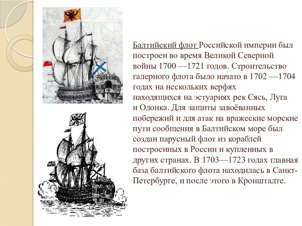 Слайд 24: Балтийский флот Российской империи был построен во время Великой Северной войны 1700 —1721 годов. Строительство галерного флота было начато в 1702 — 1704 годах на нескольких верфях находящихся на эстуариях рек Сясь, Луга и Олонка. Для защиты завоёванных побережий и для атак на вражеские морские пути сообщения в Балтийском море был создан парусный флот из кораблей построенных в России и купленных в других странах. В 1703 — 1723 годах главная база балтийского флота находилась в Санкт-Петербурге, и после этого в Кронштадте