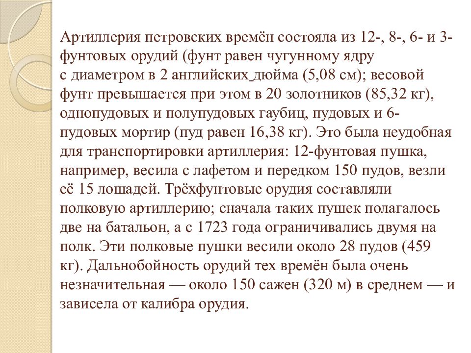 Слайд 19: Артиллерия петровских времён состояла из 12-, 8-, 6- и 3-фунтовых орудий (фунт равен чугунному ядру с диаметром в 2 английских дюйма (5,08 см ); весовой фунт превышается при этом в 20 золотников (85,32 кг ), однопудовых и полупудовых гаубиц, пудовых и 6-пудовых мортир ( пуд равен 16,38 кг). Это была неудобная для транспортировки артиллерия: 12-фунтовая пушка, например, весила с лафетом и передком 150 пудов, везли её 15 лошадей. Трёхфунтовые орудия составляли полковую артиллерию; сначала таких пушек полагалось две на батальон, а с 1723 года ограничивались двумя на полк. Эти полковые пушки весили около 28 пудов (459 кг). Дальнобойность орудий тех времён была очень незначительная — около 150 сажен (320 м) в среднем — и зависела от калибра орудия