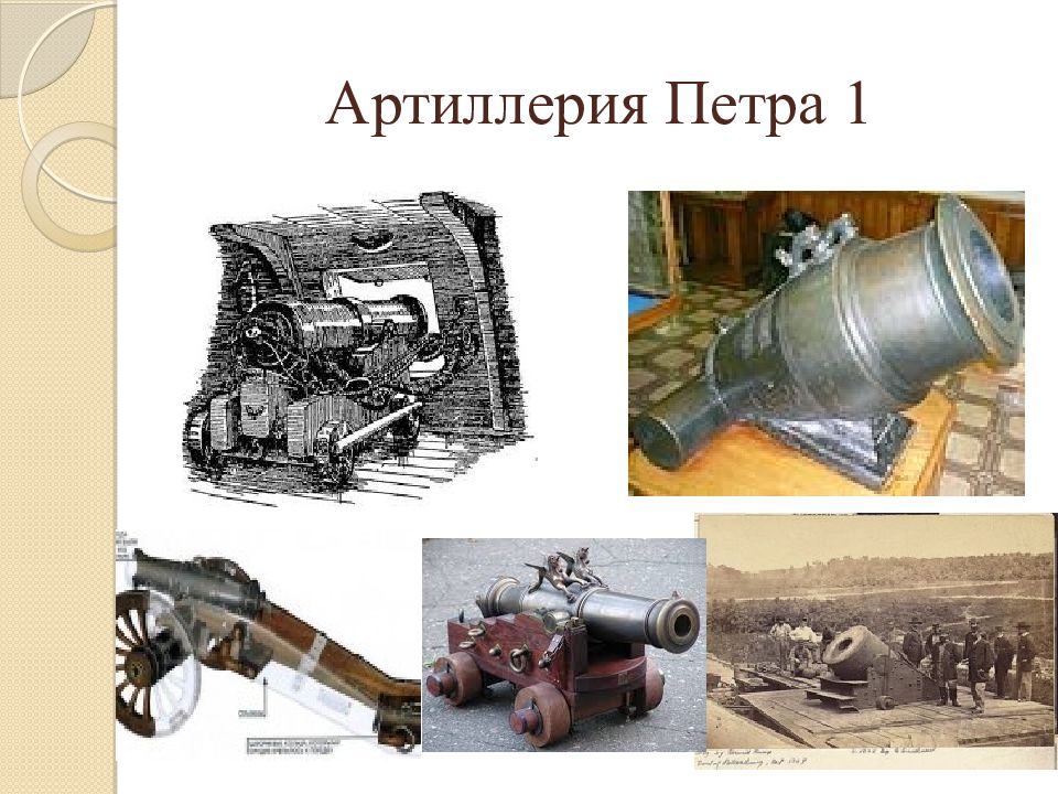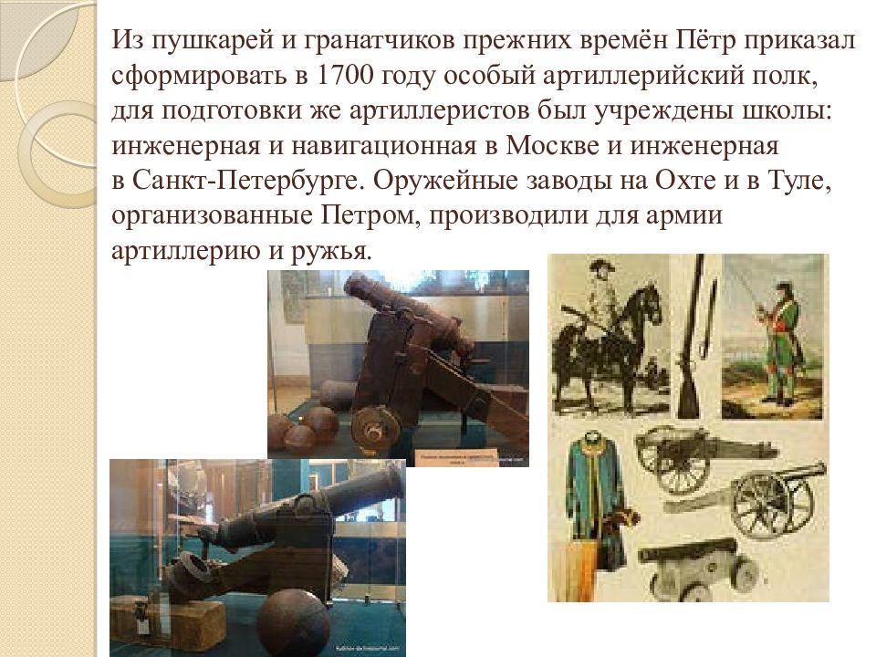 Слайд 20: Из пушкарей и гранатчиков прежних времён Пётр приказал сформировать в 1700 году особый артиллерийский полк, для подготовки же артиллеристов был учреждены школы: инженерная и навигационная в Москве и инженерная в Санкт-Петербурге. Оружейные заводы на Охте и в Туле, организованные Петром, производили для армии артиллерию и ружья
