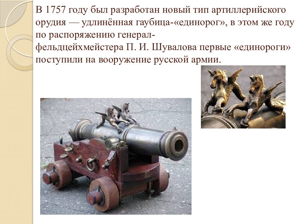 Слайд 21: В 1757 году был разработан новый тип артиллерийского орудия — удлинённая гаубица-« единорог », в этом же году по распоряжению генерал-фельдцейхмейстера П. И. Шувалова первые «единороги» поступили на вооружение русской армии