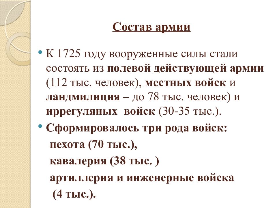 К 1725 году вооруженные силы стали состоять из полевой действующей армии (112 тыс. человек), местных войск и ландмилиция – до 78 тыс. человек) и иррегуляных войск (30-35 тыс.). Сформировалось три рода войск: пехота (70 тыс.), кавалерия (38 тыс. ) артиллерия и инженерные войска (4 тыс.).