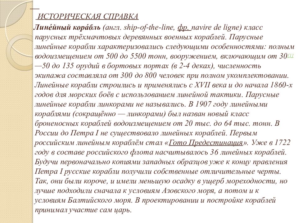 ИСТОРИЧЕСКАЯ СПРАВКА Лине́йный кора́бль (англ. ship - of - the - line, фр. navire de ligne ) класс парусных трёхмачтовых деревянных военных кораблей. Парусные линейные корабли характеризовались следующими особенностями: полным водоизмещением от 500 до 5500 тонн, вооружением, включающим от 30 [1] —50 до 135 орудий в бортовых портах (в 2-4 деках ), численность экипажа составляла от 300 до 800 человек при полном укомплектовании. Линейные корабли строились и применялись с XVII века и до начала 1860-х годов для морских боёв с использованием линейной тактики. Парусные линейные корабли линкорами не назывались. В 1907 году линейными кораблями (сокращённо — линкорами) был назван новый класс броненосных кораблей водоизмещением от 20 тыс. до 64 тыс. тонн. В России до Петра I не существовало линейных кораблей. Первым российским линейным кораблём стал « Гото Предестинация ». Уже в 1722 году в составе российского флота насчитывалось 36 линейных кораблей. Будучи первоначально копиями западных образцов уже к концу правления Петра I русские корабли получили собственные отличительные черты. Так, они были короче, и имели меньшую осадку в ущерб мореходности, но лучше подходили сначала к условиям Азовского моря, а потом и к условиям Балтийского моря. В проектировании и постройке кораблей принимал участие сам царь.
