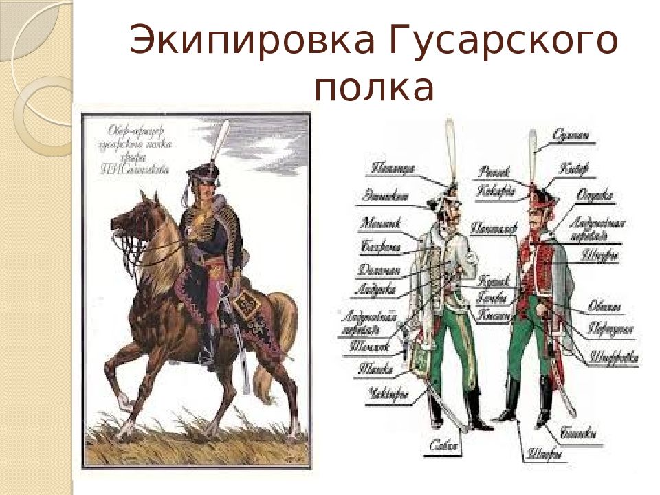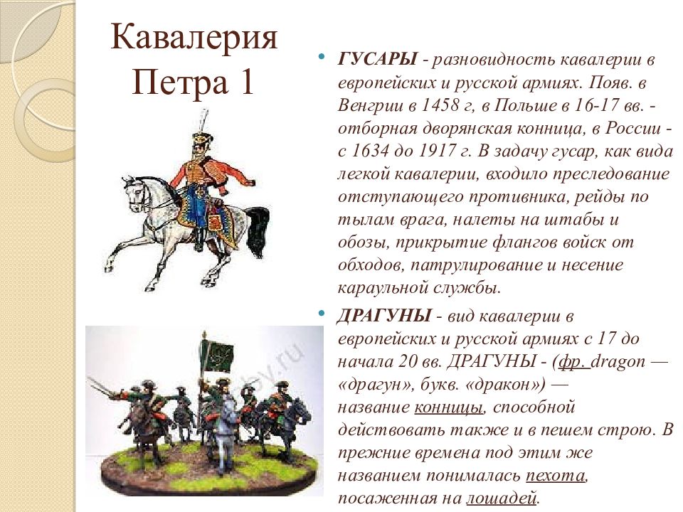 ГУСАРЫ - разновидность кавалерии в европейских и русской армиях. Появ. в Венгрии в 1458 г, в Польше в 16-17 вв. - отборная дворянская конница, в России - с 1634 до 1917 г. В задачу гусар, как вида легкой кавалерии, входило преследование отступающего противника, рейды по тылам врага, налеты на штабы и обозы, прикрытие флангов войск от обходов, патрулирование и несение караульной службы. ДРАГУНЫ - вид кавалерии в европейских и русской армиях с 17 до начала 20 вв. ДРАГУНЫ - ( фр. dragon — «драгун», букв. «дракон») — название конницы, способной действовать также и в пешем строю. В прежние времена под этим же названием понималась пехота, посаженная на лошадей.