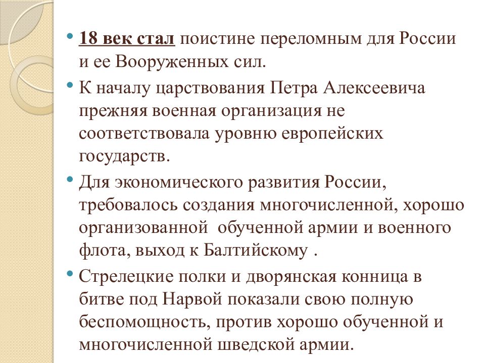 18 век стал поистине переломным для России и ее Вооруженных сил. К началу царствования Петра Алексеевича прежняя военная организация не соответствовала уровню европейских государств. Для экономического развития России, требовалось создания многочисленной, хорошо организованной обученной армии и военного флота, выход к Балтийскому. Стрелецкие полки и дворянская конница в битве под Нарвой показали свою полную беспомощность, против хорошо обученной и многочисленной шведской армии.