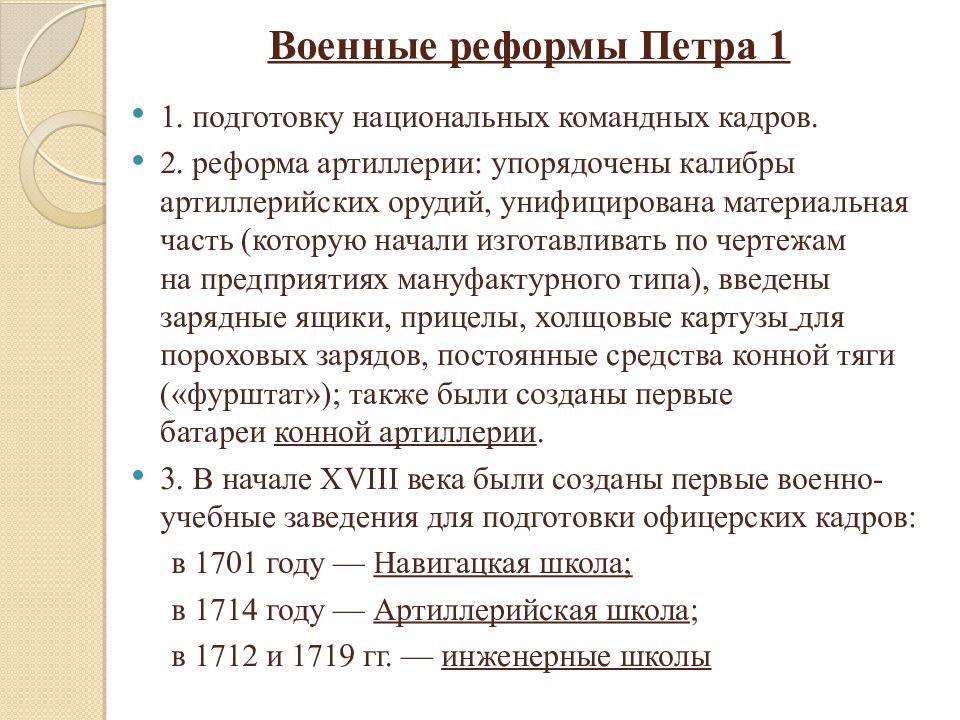 1. подготовку национальных командных кадров. 2. реформа артиллерии: упорядочены калибры артиллерийских орудий, унифицирована материальная часть (которую начали изготавливать по чертежам на предприятиях мануфактурного типа), введены зарядные ящики, прицелы, холщовые картузы для пороховых зарядов, постоянные средства конной тяги («фурштат»); также были созданы первые батареи конной артиллерии. 3. В начале XVIII века были созданы первые военно-учебные заведения для подготовки офицерских кадров: в 1701 году — Навигацкая школа; в 1714 году — Артиллерийская школа ; в 1712 и 1719 гг. — инженерные школы