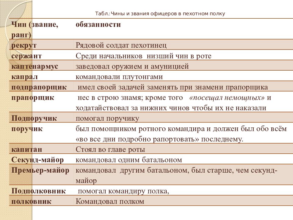 Слайд 10: Табл.: Чины и звания офицеров в пехотном полку