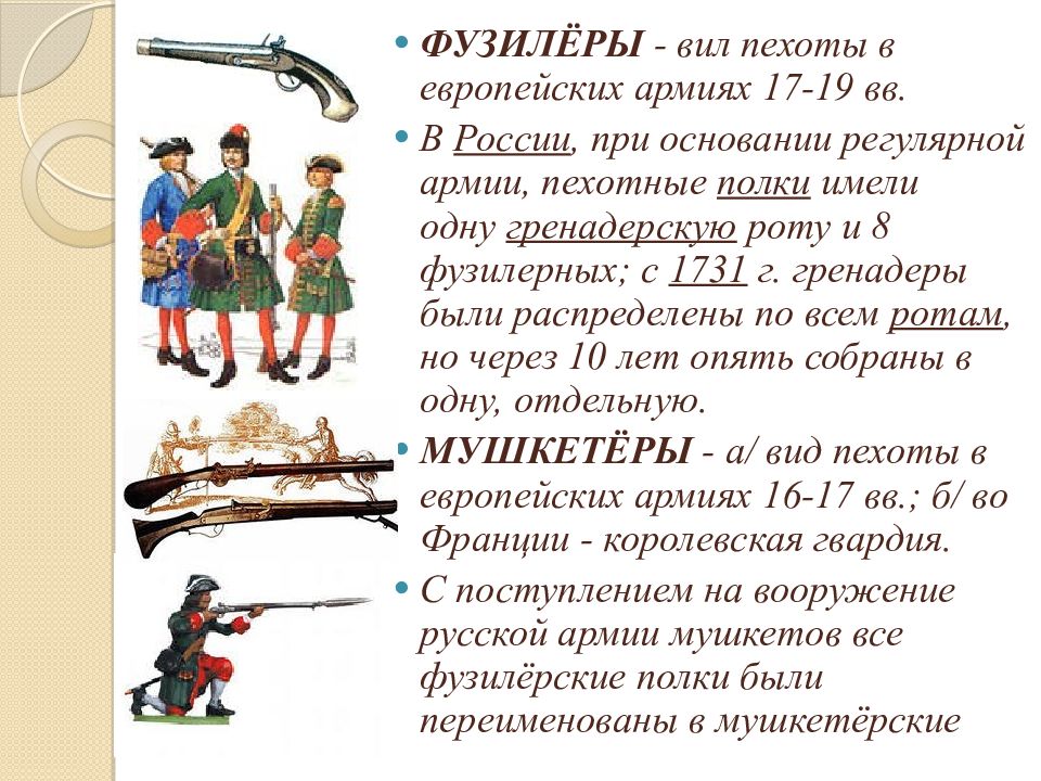 ФУЗИЛЁРЫ - вил пехоты в европейских армиях 17-19 вв. В России, при основании регулярной армии, пехотные полки имели одну гренадерскую роту и 8 фузилерных ; с 1731 г. гренадеры были распределены по всем ротам, но через 10 лет опять собраны в одну, отдельную. МУШКЕТЁРЫ - а/ вид пехоты в европейских армиях 16-17 вв.; б/ во Франции - королевская гвардия. С поступлением на вооружение русской армии мушкетов все фузилёрские полки были переименованы в мушкетёрские