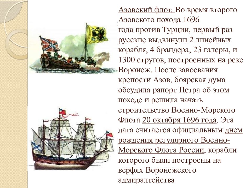 Слайд 23: Азовский флот. Во время второго Азовского похода 1696 года против Турции, первый раз русские выдвинули 2 линейных корабля, 4 брандера, 23 галеры, и 1300 стругов, построенных на реке Воронеж. После завоевания крепости Азов, боярская дума обсудила рапорт Петра об этом походе и решила начать строительство Военно-Морского Флота 20 октября 1696 года. Эта дата считается официальным днем рождения регулярного Военно-Морского Флота России, корабли которого были построены на верфях Воронежского адмиралтейства