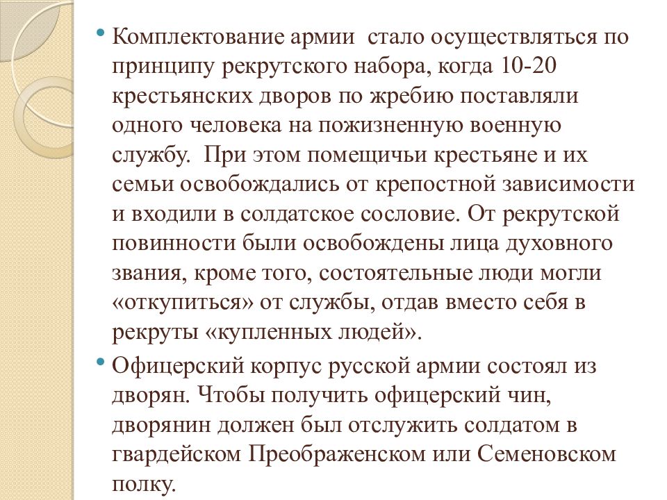 Комплектование армии стало осуществляться по принципу рекрутского набора, когда 10-20 крестьянских дворов по жребию поставляли одного человека на пожизненную военную службу. При этом помещичьи крестьяне и их семьи освобождались от крепостной зависимости и входили в солдатское сословие. От рекрутской повинности были освобождены лица духовного звания, кроме того, состоятельные люди могли «откупиться» от службы, отдав вместо себя в рекруты «купленных людей». Офицерский корпус русской армии состоял из дворян. Чтобы получить офицерский чин, дворянин должен был отслужить солдатом в гвардейском Преображенском или Семеновском полку.