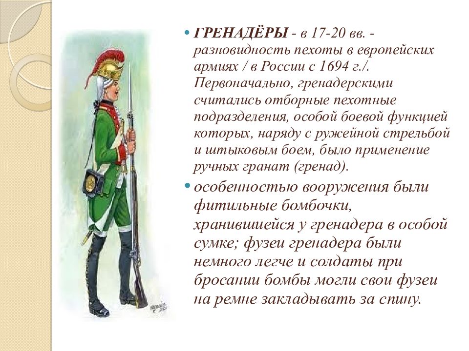 ГРЕНАДЁРЫ - в 17-20 вв. - разновидность пехоты в европейских армиях / в России с 1694 г./. Первоначально, гренадерскими считались отборные пехотные подразделения, особой боевой функцией которых, наряду с ружейной стрельбой и штыковым боем, было применение ручных гранат ( гренад ). особенностью вооружения были фитильные бомбочки, хранившиейся у гренадера в особой сумке; фузеи гренадера были немного легче и солдаты при бросании бомбы могли свои фузеи на ремне закладывать за спину.