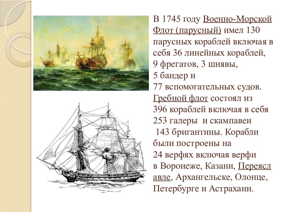 Слайд 25: В 1745 году Военно-Морской Флот (парусный) имел 130 парусных кораблей включая в себя 36 линейных кораблей, 9 фрегатов, 3 шнявы, 5 бандер и 77 вспомогательных судов. Гребной флот состоял из 396 кораблей включая в себя 253 галеры и скампавеи 143 бригантины. Корабли были построены на 24 верфях включая верфи в Воронеже, Казани, Переяславле, Архангельске, Олонце, Петербурге и Астрахани