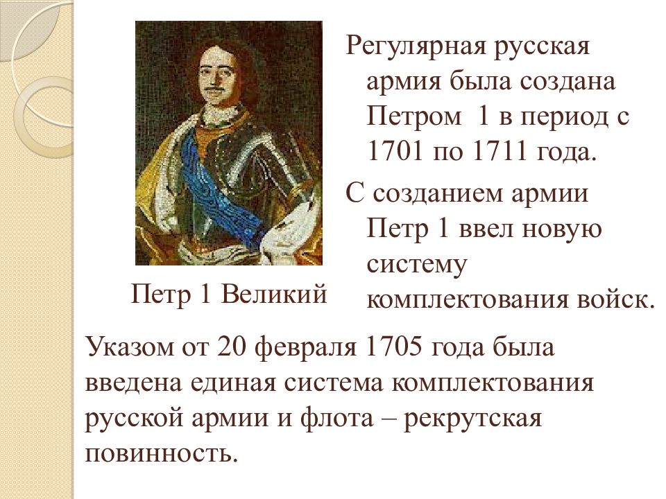 Регулярная русская армия была создана Петром 1 в период с 1701 по 1711 года. С созданием армии Петр 1 ввел новую систему комплектования войск. Петр 1 Великий Указом от 20 февраля 1705 года была введена единая система комплектования русской армии и флота – рекрутская повинность.