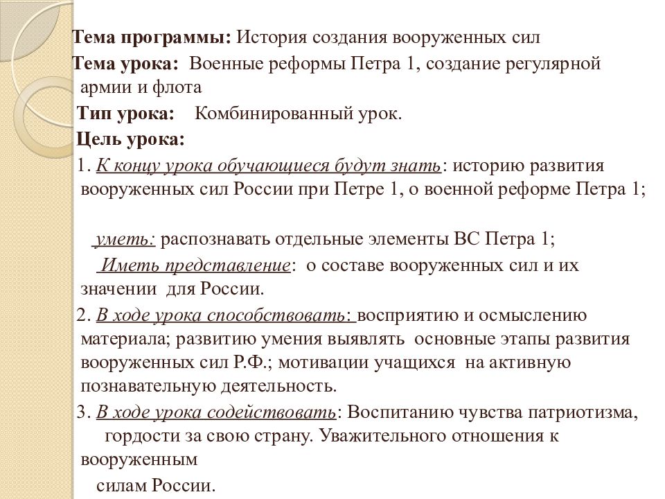 Тема программы: История создания вооруженных сил Тема урока: Военные реформы Петра 1, создание регулярной армии и флота Тип урока: Комбинированный урок. Цель урока: 1. К концу урока обучающиеся будут знать : историю развития вооруженных сил России при Петре 1, о военной реформе Петра 1; уметь: распознавать отдельные элементы ВС Петра 1; Иметь представление : о составе вооруженных сил и их значении для России. 2. В ходе урока способствовать : восприятию и осмыслению материала; развитию умения выявлять основные этапы развития вооруженных сил Р.Ф.; мотивации учащихся на активную познавательную деятельность. 3. В ходе урока содействовать : Воспитанию чувства патриотизма, гордости за свою страну. Уважительного отношения к вооруженным силам России.