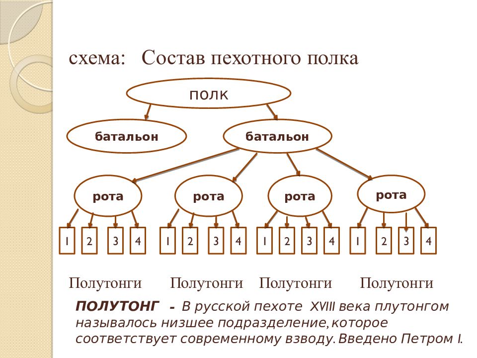 схема : Состав пехотного полка Полутонги Полутонги Полутонги Полутонги полк батальон батальон рота рота рота рота 1 2 3 4 4 2 3 1 2 3 4 2 3 1 1 4 ПОЛУТОНГ - В русской пехоте XVIII века плутонгом называлось низшее подразделение, которое соответствует современному взводу. Введено Петром I.