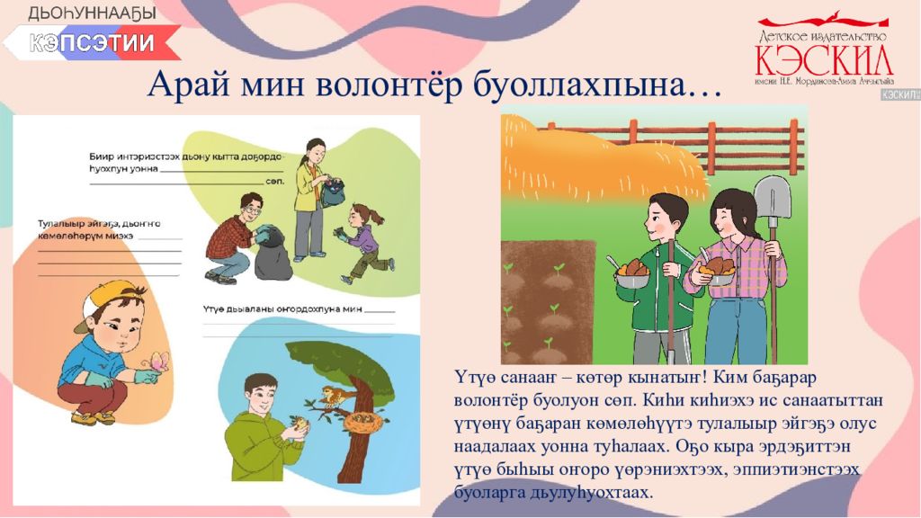 Үтүө санааҥ – көтөр кынатыҥ! Ким баҕарар волонтёр буолуон сөп. Киһи киһиэхэ ис санаатыттан үтүөнү баҕаран көмөлөһүүтэ тулалыыр эйгэҕэ олус наадалаах уонна туһалаах. Оҕо кыра эрдэҕиттэн үтүө быһыы оҥоро үөрэниэхтээх, эппиэтиэнстээх буоларга дьулуһуохтаах.