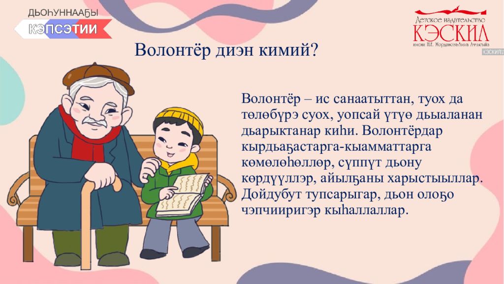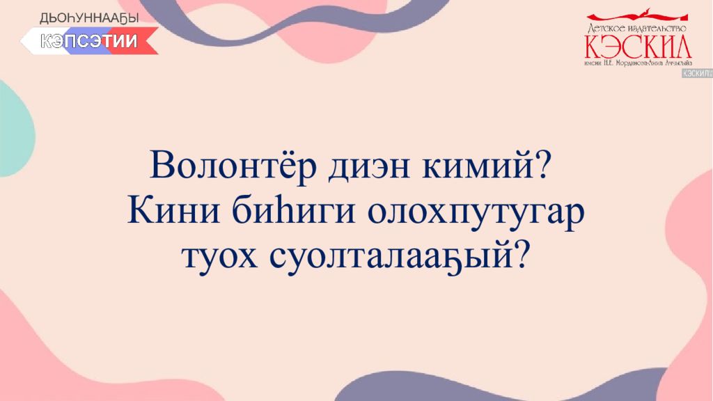 Первый слайд презентации: Волонтёр диэн кимий? Кини биһиги олохпутугар туох суолталааҕый?