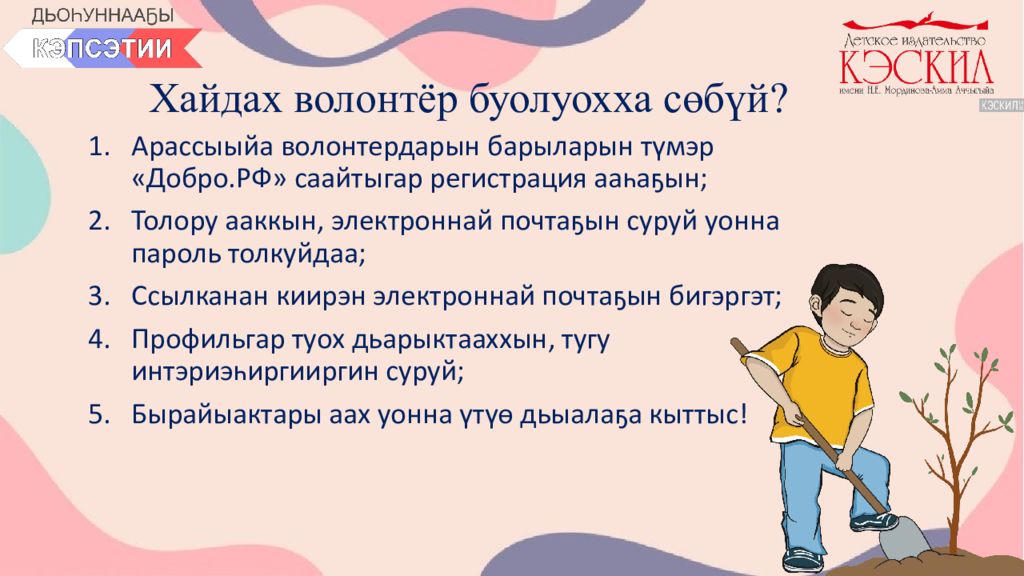 Арассыыйа волонтердарын барыларын түмэр « Добро.РФ » саайтыгар регистрация аа һаҕын; Толору ааккын, электроннай почтаҕын суруй уонна пароль толкуйдаа; Ссылканан киирэн электроннай почтаҕын бигэргэт; Профильгар туох дьарыктааххын, тугу интэриэһиргииргин суруй; Бырайыактары аах уонна үтүө дьыалаҕа кыттыс!