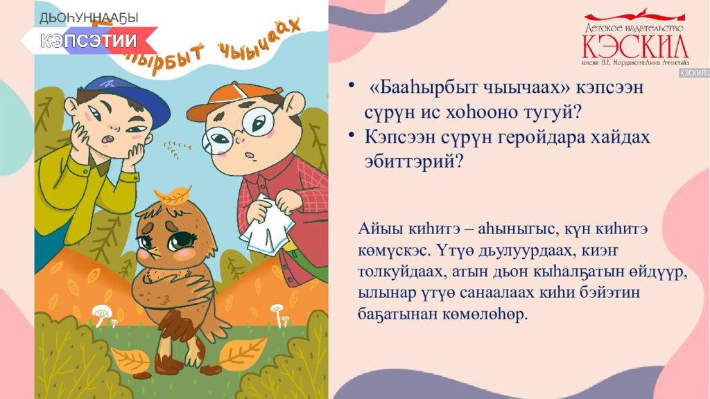 «Бааһырбыт чыычаах» кэпсээн сүрүн ис хоһооно тугуй? Кэпсээн сүрүн геройдара хайдах эбиттэрий? Айыы киһитэ – аһыныгыс, күн киһитэ көмүскэс. Үтүө дьулуурдаах, киэҥ толкуйдаах, атын дьон кыһалҕатын өйдүүр, ылынар үтүө санаалаах киһи бэйэтин баҕатынан көмөлөһөр.