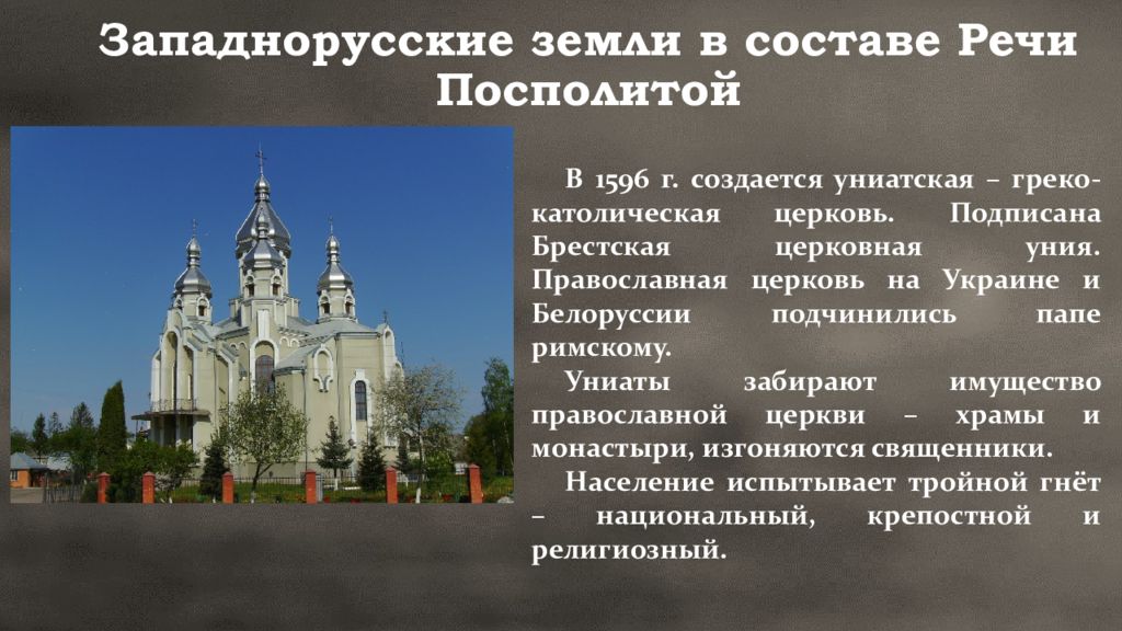 В 1596 г. создается униатская – греко-католическая церковь. Подписана Брестская церковная уния. Православная церковь на Украине и Белоруссии подчинились папе римскому. Униаты забирают имущество православной церкви – храмы и монастыри, изгоняются священники. Население испытывает тройной гнёт – национальный, крепостной и религиозный.