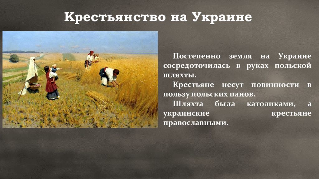 Постепенно земля на Украине сосредоточилась в руках польской шляхты. Крестьяне несут повинности в пользу польских панов. Шляхта была католиками, а украинские крестьяне православными.