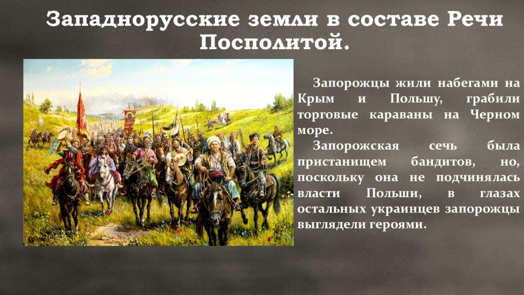 Запорожцы жили набегами на Крым и Польшу, грабили торговые караваны на Черном море. Запорожская сечь была пристанищем бандитов, но, поскольку она не подчинялась власти Польши, в глазах остальных украинцев запорожцы выглядели героями.