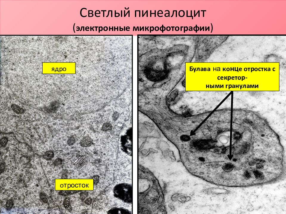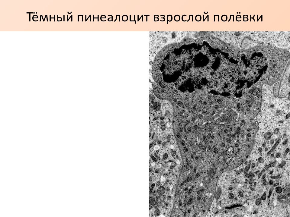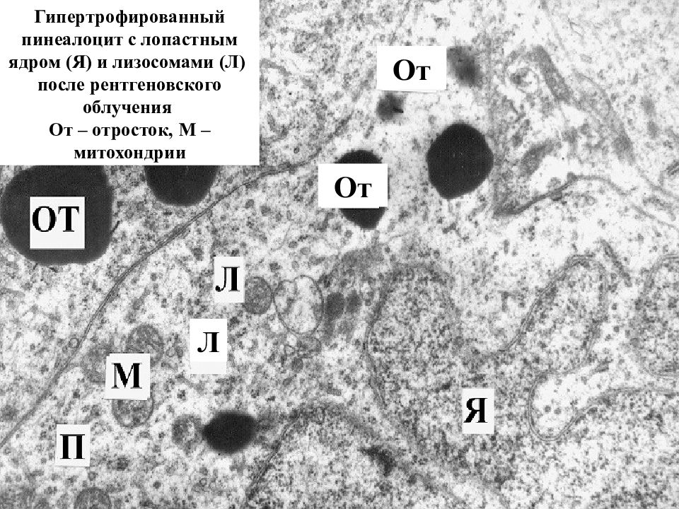 От От Л Гипертрофированный пинеалоцит с лопастным ядром (Я) и лизосомами (Л) после рентгеновского облучения От – отросток, М – митохондрии