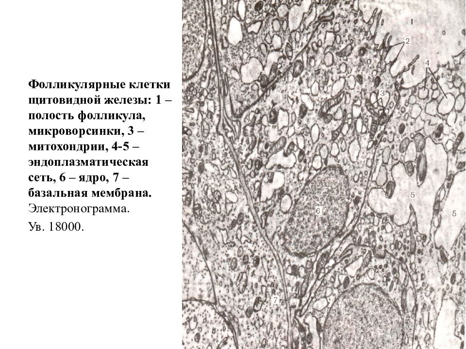 Фолликулярные клетки щитовидной железы: 1 – полость фолликула, микроворсинки, 3 – митохондрии, 4-5 – эндоплазматическая сеть, 6 – ядро, 7 – базальная мембрана. Электронограмма. Ув. 18000.