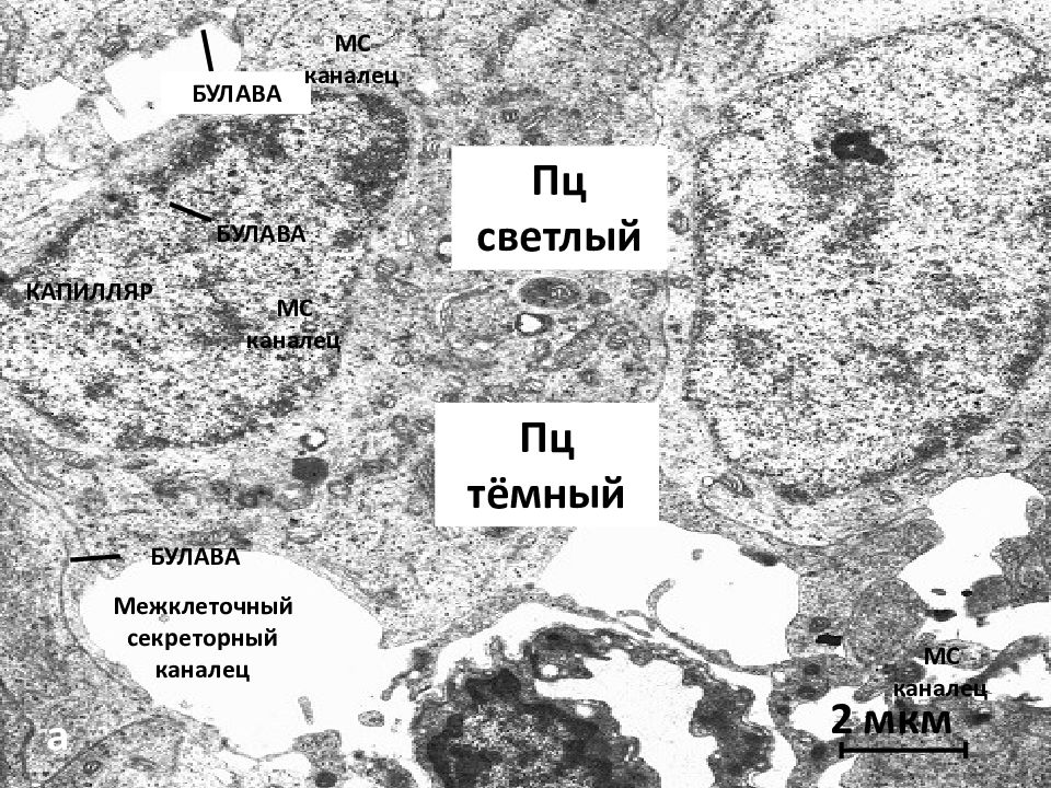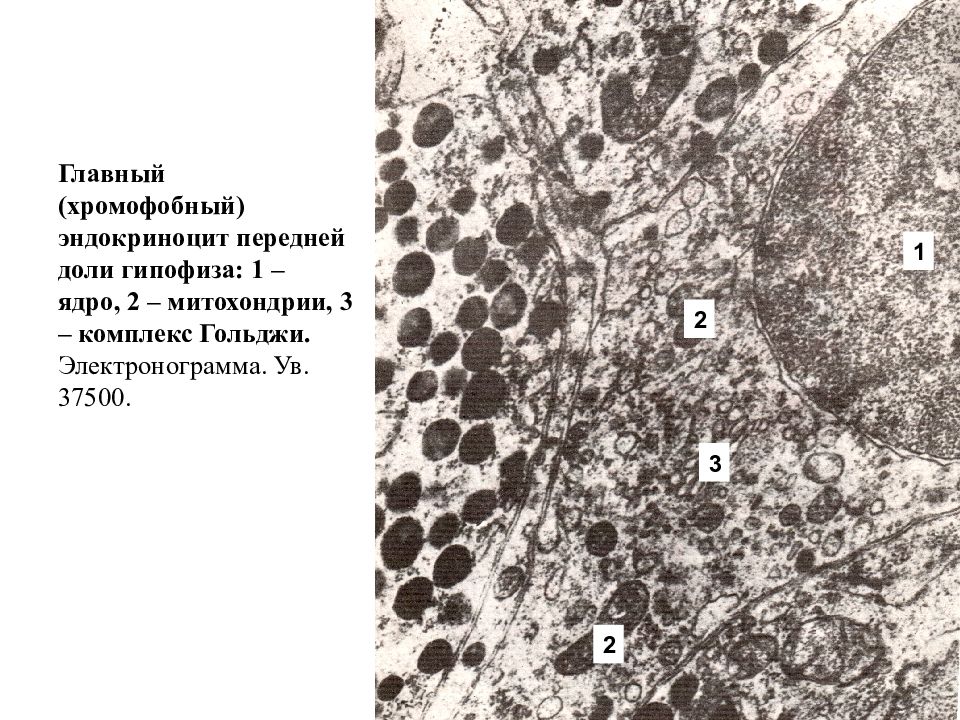 Главный (хромофобный) эндокриноцит передней доли гипофиза: 1 – ядро, 2 – митохондрии, 3 – комплекс Гольджи. Электронограмма. Ув. 37500. 1 2 2 3