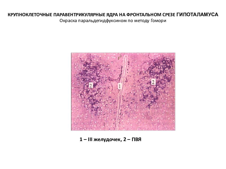 КРУПНОКЛЕТОЧНЫЕ ПАРАВЕНТРИКУЛЯРНЫЕ ЯДРА НА ФРОНТАЛЬНОМ СРЕЗЕ ГИПОТАЛАМУСА Окраска паральдегидфуксином по методу Гомори 1 – III желудочек, 2 – ПВЯ