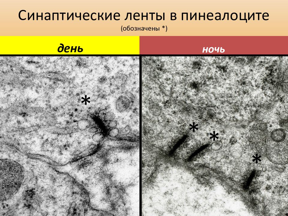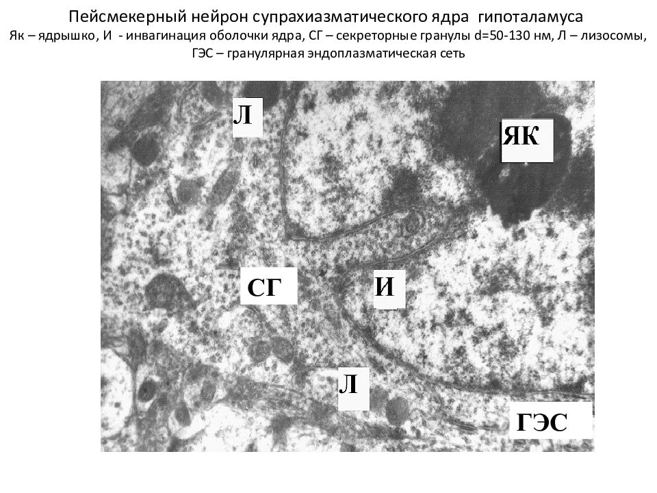СГ ГЭС Пейсмекерный нейрон супрахиазматического ядра гипоталамуса Як – ядрышко, И - инвагинация оболочки ядра, СГ – секреторные гранулы d= 50-130 нм, Л – лизосомы, ГЭС – гранулярная эндоплазматическая сеть