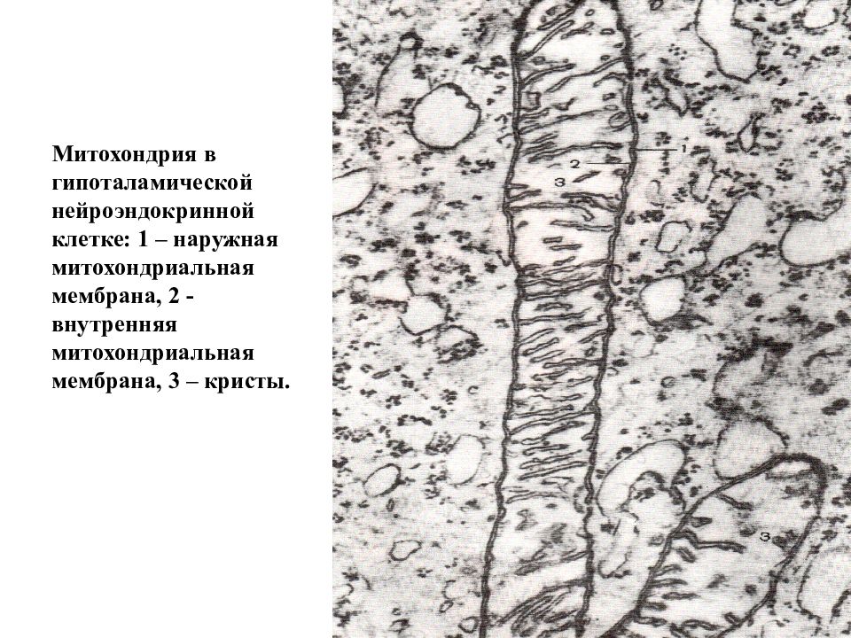 Митохондрия в гипоталамической нейроэндокринной клетке: 1 – наружная митохондриальная мембрана, 2 - внутренняя митохондриальная мембрана, 3 – кристы.
