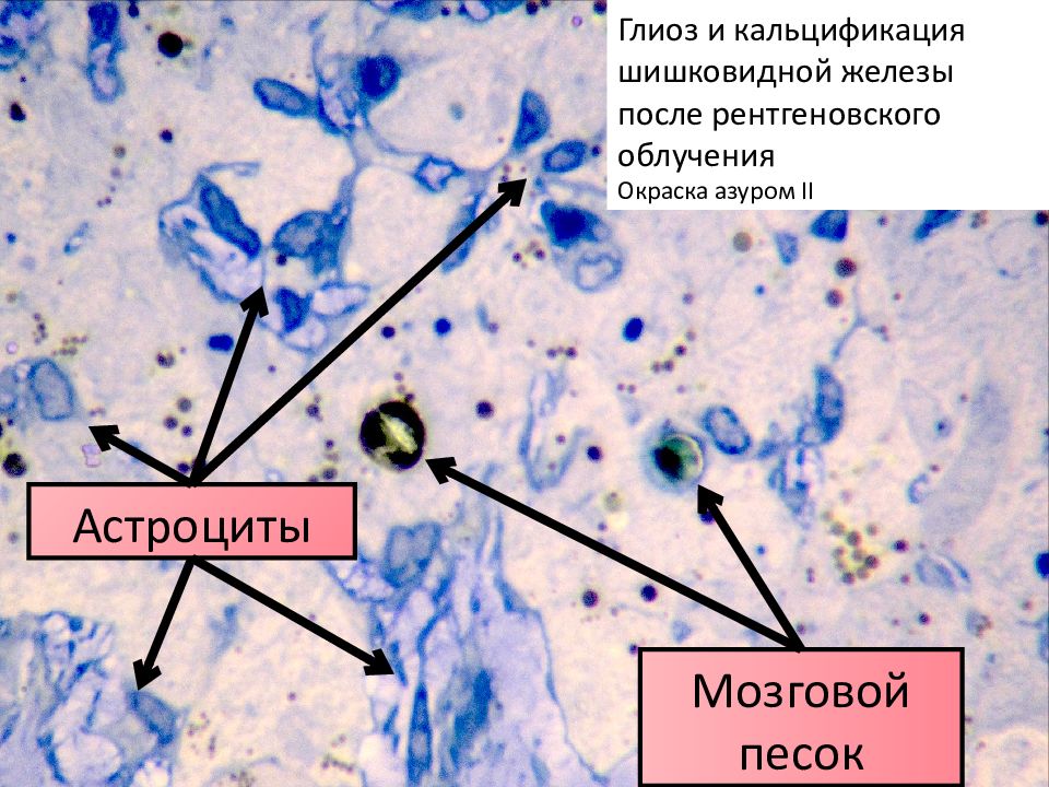 Астроциты Мозговой песок Глиоз и кальцификация шишковидной железы после рентгеновского облучения Окраска азуром II