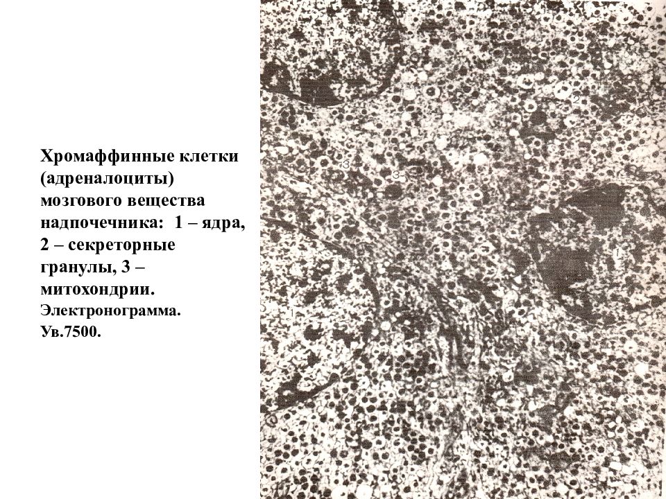 Слайд 7: Хромаффинные клетки (адреналоциты) мозгового вещества надпочечника: 1 – ядра, 2 – секреторные гранулы, 3 – митохондрии. Электронограмма. Ув.7500