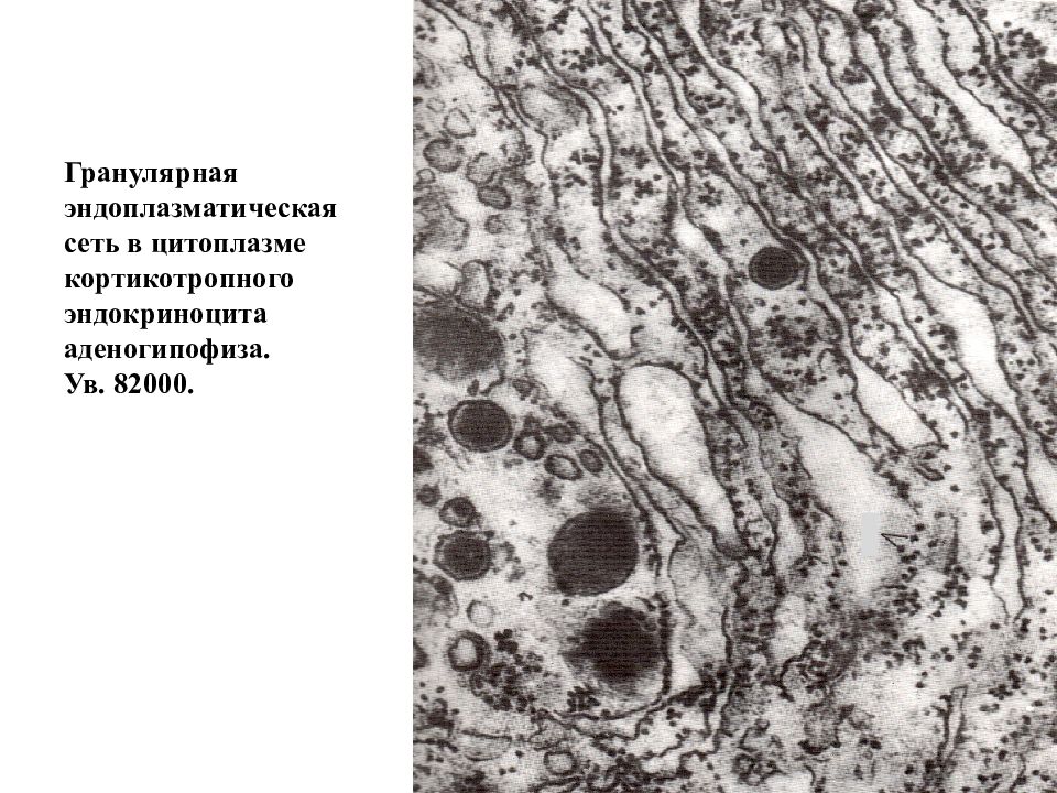 Слайд 4: Гранулярная эндоплазматическая сеть в цитоплазме кортикотропного эндокриноцита аденогипофиза. Ув. 82000