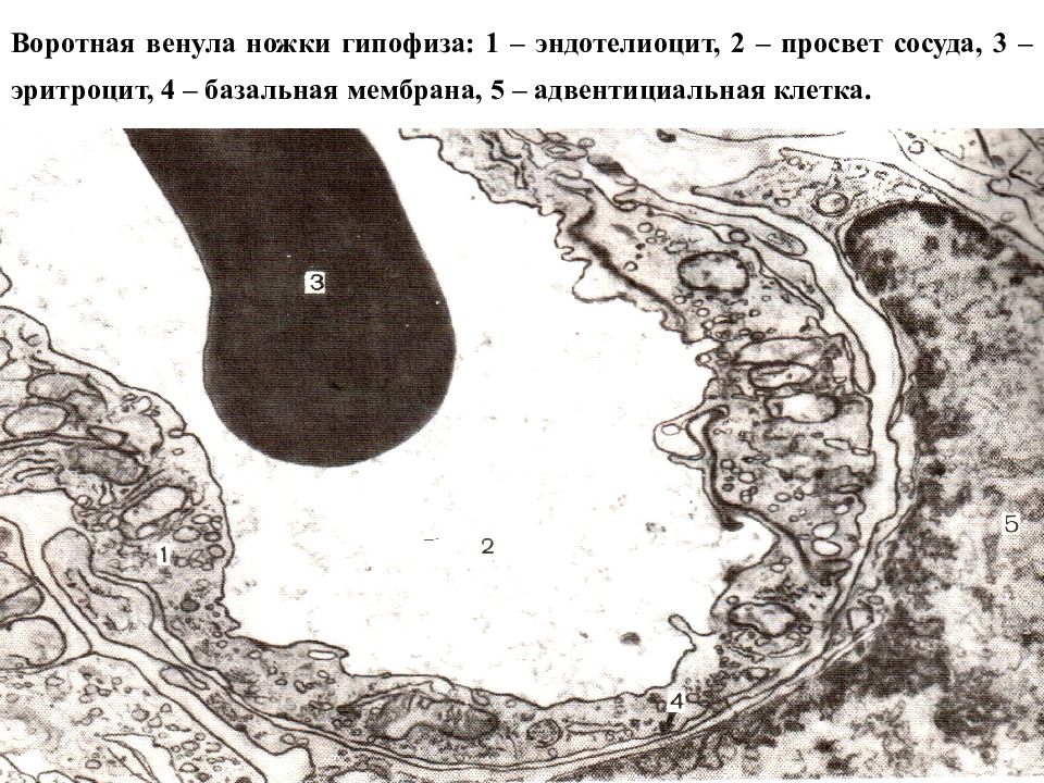 Первый слайд презентации: Воротная венула ножки гипофиза: 1 – эндотелиоцит, 2 – просвет сосуда, 3 – эритроцит, 4 – базальная мембрана, 5 – адвентициальная клетка